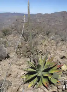 Agave gigantensis is a large, flowering agave plant found in Baja California Sur, Mexico. Its name is derived from the area of origin, not its large size. The plant is distinguishable by its red and purple leaves during flowering season. It is able to survive in harsh, rocky conditions and prefers dry and warm environments. The flowers of A. gigantensis are arranged in small clusters which diverge from a main branch. Unlike many other agave plants, A. gigantensis has been traditionally used in food and medicine by communities of western Mexico.