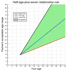 That a person should never date someone under half their age plus seven is a rule of thumb sometimes used to determine whether an age difference is socially acceptable.[66][67][68][69] Although the origin of the rule is unclear, it is sometimes considered to have French origin.[67]