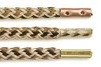 An aglet (/ˈæɡlət/ AG-lət)[1] or aiglet is a small sheath, often made of plastic or metal, used on each end of a shoelace, a cord, or a drawstring.[2] An aglet keeps the fibers of the lace or cord from unraveling; its firmness and narrow profile make it easier to hold and easier to feed through eyelets, lugs, or other lacing guides.