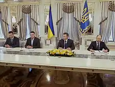 An agreement to resolve the political crisis was signed by the President of Ukraine Viktor Yanukovych and opposition leaders Vitali Klitschko (Ukrainian Democratic Alliance for Reform), Arseniy Yatsenyuk (All-Ukrainian Union "Fatherland") and Oleh Tyahnybok (Svoboda). Witnessing the signing was made by the foreign Ministers of Germany and Poland – Frank-Walter Steinmeier, Sikorski and head of the Department for continental Europe of the Ministry of foreign Affairs of the French Republic Eric Fournier. Special representative of the President of the Russian Federation Vladimir Lukin, who participated in the negotiations, refused to put his signature under the agreement.[1]