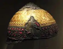 The helmet has been described as having a jockey-cap shape, but the "bill" of the cap is actually a neck-guard.[12] It is 21.4 centimetres (8.4 in) high and 23 by 19 centimetres (9.1 by 7.5 in) laterally.[13] The inner cap of the helmet is of iron, now heavily corroded.[2] It is made of a single piece of hammered iron, with the neck guard riveted to the back.[11] The iron is entirely covered by ornamental bronze bands with low-relief decoration formed partly by casting and partly by repoussé and chasing.[11] The four wide horizontal strips of bronze are fully covered with gold leaf on the outside surface. The decorations include embedded cabochons of shaped and polished coral.[2]