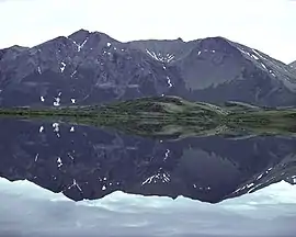 ![]() View of the Ahklun Mountains reflected in a mirror-smooth glacial lake | |