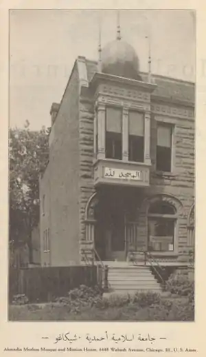 In 1922, Sadiq once again returned to Chicago and re-established the national headquarters of the movement at 4448 Wabash Avenue.[33] A converted house was used to serve as a mosque and a mission house. The mission house was from where the oldest Islamic magazine The Moslem Sunrise was to be published from. Whilst based in Chicago, Sadiq continued to deliver his public lectures on Islam at schools, clubs and lodges across the Midwest. Many a times he was successful in removing misconceptions concerning the religion and occasionally his speeches attracted converts. In 1923, Sadiq gave multiple lectures at the Universal Negro Improvement Association, as a result of which he converted 40 members of the fraternal organization to Islam.[34][35] In September 1923, Sadiq left the United States for India. He was replaced by Muhammad Din, another missionary to the Community. During his three years, Sadiq had converted 700 Americans to Islam.[36] Named in honour of Mufti Muhammad Sadiq, Wabash Avenue is today the site of the Al-Sadiq Mosque, the oldest standing mosque in the United States.