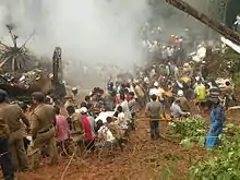 "The plane broke in two", said one survivor, "and a dense black smoke invaded the cabin. I jumped out through an opening in the window. Six other passengers followed me. We fled, with the help of the inhabitants of the nearby village".[36] Local villagers were among the first on the scene to help,[37] while an estimated 15 fire trucks, 20 ambulances and 100 rescue workers were immediately allocated to rescue operations.[27][38] The Karnataka Western Range Inspector General of Police, Gopal Hosur, said that eight to ten people had been moved to hospitals and that the Karnataka Police force, bomb squad, Karnataka Fire and Emergency Services, Karnataka State Reserve Police and all hospitals were working together to help out. The Central Industrial Security Force (CISF) sent 150 personnel to Mangalore to help in the relief and rescue operations.[7] Bodies of all of the deceased were recovered from the crash site on the day of the crash,[39] with relatives of the deceased receiving 87 of the bodies.[40]