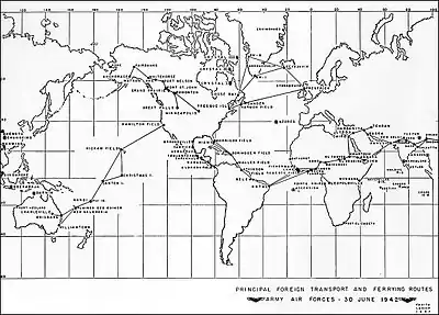 - The South Atlantic air ferry route linked the US with West Africa via Natal, Brazil, the Middle East, India and China.[7]