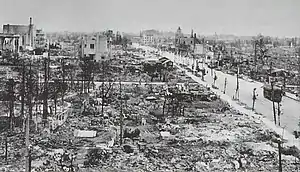 USAAF planners began assessing the feasibility of a firebombing campaign against Japanese cities in 1943. Japan's main industrial facilities were vulnerable to such attacks as they were concentrated in several large cities and a high proportion of production took place in homes and small factories in urban areas. The planners estimated that incendiary bomb attacks on Japan's six largest cities could cause physical damage to almost 40 percent of industrial facilities and result in the loss of 7.6 million man-months of labor. It was also estimated that these attacks would kill over 500,000 people, render about 7.75 million homeless and force almost 3.5 million to be evacuated.[90][91] In 1943 the USAAF tested the effectiveness of incendiary bombs on Japanese-style buildings at Eglin Field and the "Japanese village" at Dugway Proving Ground.[92] The American military also attempted to develop "bat bombs", using incendiary bombs attached to bats dropped by aircraft to attack Japanese cities, but this project was abandoned in 1944.[93] During early 1945 the USAAF conducted raids against cities in Formosa to trial tactics which could be later used against Japanese urban areas.[94]