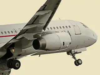 The first derivative of the A320 was the Airbus A321, also known as the Stretched A320, A320-500 and A325.[8][24] Its launch came on 24 November 1988 after commitments for 183 aircraft from 10 customers were secured.[8][25] The aircraft would be a minimum-changed derivative, apart from a number of minor modifications to the wing, and the fuselage stretch itself. The wing would incorporate double-slotted flaps and minor trailing edge modifications,[8] increasing the wing area from 124 m2 (1,330 sq ft) to 128 m2 (1,380 sq ft).[26] The fuselage was lengthened by four plugs (two ahead and two behind the wings), giving the A321 an overall length of 6.94 metres (22 ft 9 in) longer than the A320.[8][27][28] The length increase required the overwing exits of the A320 to be enlarged and repositioned in front of and behind the wings.[13] The centre fuselage and undercarriage were reinforced to accommodate the increase in maximum takeoff weight of 9,600 kg (21,200 lb), taking it to 83,000 kg (183,000 lb).[8]