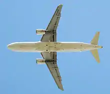 | A Jetstar Airways A320 in flight. The A320 is a low wing airliner with twin underwing turbofans | |