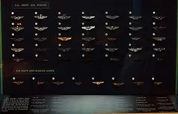 The Aircrew Badge, commonly known as Wings, is a qualification badge of the United States military that is awarded by all five branches of armed services to personnel who serve as aircrew members on board military aircraft. The badge is intended to recognize the training and qualifications required by aircrew of military aircraft. In order to qualify as an aircrew member and receive the Aircrew Badge, such personnel typically undergo advanced training in aircraft in-flight support roles.