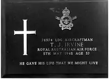 A second unit, the Defence Pool, was established at Noemfoor in December 1944.[8] It is believed that guards may have been trained at the Security Guards Unit and then posted to the Defence Pool for operational deployment. A detachment of the Defence Pool was deployed to Morotai island in early 1945 in order to prepare a camp for the arrival of the main party of the unit. The Defence Pool was subsequently ordered to be disbanded on 28 March 1945; however a reconsideration led to the establishment of No. 2 Airfield Defence Squadron. By May of that year ADGs had participated in a number of operations, including the recapture of Tarakan,[9] Brunei and Balikpapan.[10] They had also suffered casualties, among them Leading Aircraftman Thomas Irvine and Corporal Clarence Tully[11] who were killed during Japanese raids on Tarakan airfield. LAC Irvine died on 5 May 1945[12] and is believed to be the first ADG killed by enemy action; he is buried in the Commonwealth War Graves Cemetery on Labuan Island.