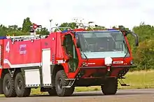 Most airport fire appliances are equipped with a roof-mounted high volume 'monitor' or 'nozzle' which can shoot fire extinguishing media huge distances. This means that an approaching fire appliance can begin tackling flames before it has arrived close to the scene of the fire.