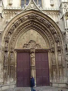 The building of the new church was interrupted by the Black Death and then the Hundred Years' War. Work did not resume for 130 years, until 1472, when the last bay was built. The façade took another thirty years, and the last statues were not put in place until 1513, at the beginning of the Renaissance.