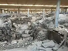 The Akrotiri excavation site is of a Cycladic cultural settlement on the Greek island of Santorini, associated with the Minoan civilization due to inscriptions in Linear A, and close similarities in artifact and fresco styles.[3] The excavation is named for a modern village situated on a hill nearby. The name of the site in antiquity is unknown.