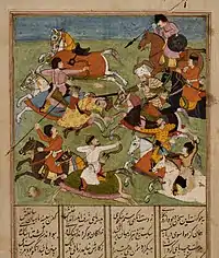 Rostam returned to his sleeping spring, but did not find Rakhsh. He set out on foot and reached a farm. There he found his horse with a herd of Afrasiab horses, then mounted the horse and took the herd of Afrasiab horses with him. Rostam was attacked by the Afrasiab Corps at the end of work and fought with all of the Turanian soldiers one trunk. He killed more than a hundred people in the battle.
