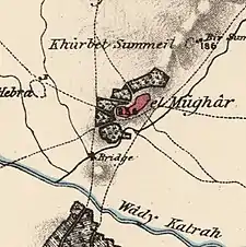 In 1838, el Mughar was noted by Edward Robinson from Aqir,[10] he further noted it as a Muslim village in the Gaza district.[11]