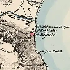 Al-Majdal (Arabic: المجدل, "tower", also transliterated Majdal, Majdil and Mejdel) was a Palestinian Arab village, located on the western shore of the Sea of Galilee (200 meters (660 ft) below sea level), 3 miles (4.8 km) north of Tiberias and south of Khan Minyeh.[2][5][6] It is identified with the site of the ancient town of Magdala, reputed to be the birthplace of Mary Magdalene.[7]