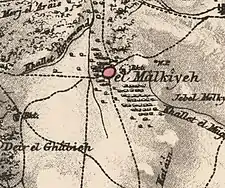 Victor Guérin visited in 1875, and noted that Al-Malkiyya had 300 Metawali inhabitants.[10] He further noted that the village, which stood upon a lofty summit, was remarkable for possessing neither well nor cistern; the women fetched their water from the spring at Kades. But a birkeh was placed on the map close to the village.[11]