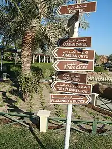 The park features 100,000 planted flora and trees, & more than 45 species of animals, 82 species of birds and 25 species of flora.[6] Species that roam the nature reserve section of the park include the Arabian oryx, which is extinct in the wild, South African cheetah, lion, Savannah monitor, African rock python, Persian gazelle, springbok, African wild dog, Spotted hyena, saluki dogs,[7] impala, fallow deer, Chapman's zebra, Honey badger and desert hares.[8] Arabian and North African species such as the scimitar-horned oryx, addax (which is rare in the wild), dama gazelle, giraffes, Nubian ibex, wild goat, barbary sheep and Asiatic onager are also present.[9] The park also employs a captive breeding policy of endangered species.[10]