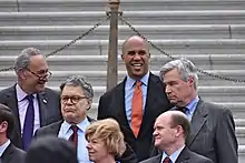 Although Franken had asked to be allowed to appear before the Senate Ethics Committee to give his side of the story, on December 6 Senate Minority Leader Chuck Schumer told him he had to announce his resignation by five o’clock or he could be censured and stripped of committee assignments. On December 7, Franken announced his intention to resign his Senate seat.[140] He called some of the accusations "simply not true" and said he remembered others "very differently".[141] In his resignation speech he made comparisons to Republican politicians, saying he was "aware of the irony" that President Trump remained in office despite the comments Trump made in the Access Hollywood tape released a month before his election, and that the Republican Party supported Roy Moore's Senate campaign despite the many allegations of harassment and molestation against Moore.[142] Franken resigned on January 2, 2018, and Minnesota governor Mark Dayton appointed the lieutenant governor, Tina Smith, to Franken's seat until a November 2018 special election, which Smith won.[143]