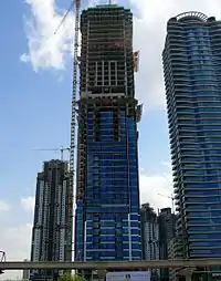 The Al Tayer Tower is a 59-floor residential tower in Dubai, United Arab Emirates. Its location along Sheikh Zayed Road gives it close proximity to Downtown Dubai (the district that includes the Burj Khalifa and the Dubai Mall) and Business Bay. The design of the tower was completed in 2005,[1] but ground works did not begin until Spring 2006. The building began to rise above ground level in December 2006. The first glass was put on the building in April 2007, but this was only two windows. Not until September did major cladding begin. Tower will have a total of 244 apartments that come in various sizes.[1] Built behind the tower will be an 11-floor parking garage, also built by Al Shafar General Contracting Co. LLC.[4]