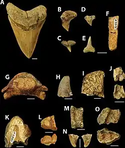 The amalgamated conglomerates contain the most abundant vertebrate fossils, both well-preserved remains of marine vertebrates (e.g., sharks) and highly weathered remains of terrestrial vertebrates. The conglomerate exhibits a dm-scale gradational contact with a poorly sorted, fine-to-medium-grained sandstone with abundant lithic and feldspar grains. The sandstone is locally tuffaceous and exhibits, in some exposures, low-angle, dm-thick bedforms that are internally massive and dip perpendicularly to the overall attitude of the Alajuela Formation. Otherwise, the sandstone appears massive and highly bioturbated, containing a lower density of molluscan molds than the underlying conglomerate. Original molluscan shell material and marine vertebrate fossils are present but rare. No terrestrial vertebrate remains have been found within the sandstone horizons of Unit A.[10]