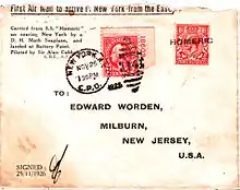 On 25 November 1926, Cobham attempted but failed to be the first person to deliver mail to New York City by air from the east, planning to fly mail from the White Star ocean liner RMS Homeric in a de Havilland DH.60 Moth floatplane when the ship was about 12 hours from New York harbour on a westbound crossing from Southampton. After the Moth was lowered from the ship, however, Cobham was unable to take off owing to rough water and had to be towed into port by the ship. The same year Cobham was awarded the Gold Medal by the Fédération Aéronautique Internationale.[5]