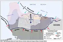 The Alaska North Slope region includes the National Petroleum Reserve–Alaska, with the bulk of Alaska's known petroleum until the Prudhoe Bay Oil Field was discovered in 1968, followed by the Kuparuk River oil field in 1969. The region also includes the Arctic National Wildlife Refuge, which itself has been the subject of controversy surrounding the possibility of petroleum drilling within its boundaries. The petroleum extracted from the region is transferred south by means of the Trans-Alaska Pipeline System to Valdez on the Pacific Ocean.[1] Under the North Slope is an ancient seabed, which is the source of the oil. Within the North Slope, there is a geological feature called the Barrow Arch – a belt of the kind of rock known to be able to serve as a trap for oil. It runs from the city of Utqiagvik to a point just west of the Arctic National Wildlife Refuge.[1][2] The Arctic Alaska Petroleum Province, encompassing all the lands and adjacent Continental Shelf areas north of the Brooks Range-Herald arch (see map) were estimated by the USGS in 2005 to hold more than 50 billion bbl of oil and natural-gas liquids and 227 trillion cubic feet of gas.[2]
