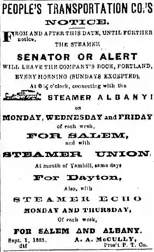 On September 1, 1868 the People's Transportation Company placed Albany on a schedule of running from Oregon City to Salem Oregon three times a week on Mondays, Wednesdays, and Fridays.[9] A connection was made at Oregon City with either of the sternwheelers Senator or Alert running daily (Sunday excepted) from Portland.[9]
