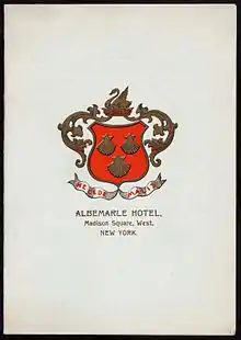 Albemarle Hotel was located in New York City at the junction of Broadway, Fifth Avenue, and 24th Street, facing Madison Square. Its location was convenient to theatres, churches, halls, clubs, and retail stores. It was opened by George D. Ives[5] in 1860. Proprietors included Louis H. Janvrin and Henry Walter (d. 1903) who refitted and furnished it. The culinary department was under the management of a French chef, and the cuisine included the rarest of everything that the markets provided.[6]