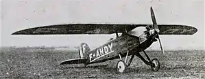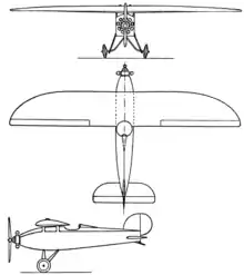 The fuselage was constructed from spruce and ply box girders and was ply covered, with flat sides and bottom and a pitched top.[3] The engine was mounted uncowled on a steel tube frame[3] and the open single cockpit was half under the trailing edge, allowing clear views above and below the wing.[1] Its empenange was conventional and of similar construction to the wing; the tailplane was mounted at mid-fuselage and had a plan similar to that of the wing, with full span, narrow chord elevators controlled by rods. The vertical fin was quadrant shaped and carried a cable controlled semi-circular rudder that extended down as far as the tailplane.[1][3]