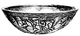 The numismatic evidence as well as the so-called "Hephthalite bowl" from Gandhara, now in the British Museum, suggests a period of peaceful coexistence between the Kidarites and the Alchons, as it features two Kidarite noble hunters wearing their characteristic crowns, together with two Alchon hunters and one of the Alchons inside a medallion.[45] At one point, the Kidarites withdrew from Gandhara, and the Alchons took over their mints from the time of Khingila.[45]