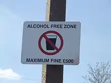 An alcohol-free zone is a geographic area, location or establishment where the public consumption and sale of alcoholic beverages is prohibited.[1][2] Alcohol-free zones have been established in some areas to address problems with drinking- and binge drinking-related crime, antisocial behavior, assaults and disorderly behavior.[3][4] Alcohol-free zones have been opposed in some communities, such as in Bath, England, which has "a tradition of open-air bars and restaurants."[3]