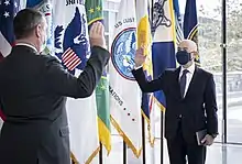 Mayorkas was sworn in by Vice President Kamala Harris on February 2, 2021, after his confirmation that day.[50]