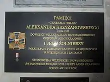 Aleksander Krzyżanowski nom de guerre "Wilk" (18 February 1895 – 29 September 1951) was an artillery colonel of the Polish Army, officer of the Service for Poland's Victory, Union of Armed Struggle, commander of the Vilnius District of the Home Army, political prisoner of the Stalinist period. In 1994 he was posthumously promoted to the rank of brigade general.[1]