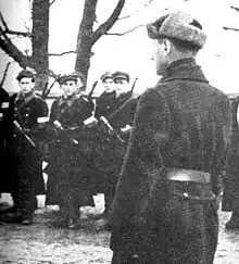 In May 1944 Polish resistance units were attacked by the Lithuanian Territorial Defense Force under General Povilas Plechavičius. Krzyżanowski attempted to negotiate, but Plechavičius demanded that AK and all Polish partisans were to retreat from the Vilnius region or accept Lithuanian sovereignty over that territory.[8] Krzyżanowski would not agree to such a withdrawal and the fighting escalated, eventually culminating in the Polish victory over the Lithuanian collaborationist forces in the battle of Murowana Oszmianka[2] of May 13-May 14.[8] After that battle Krzyżanowski attempted to resume negotiations but was ignored by the Lithuanian side.[8] The increasing hostilities culminated in June, when Lithuanian pro-Nazi[9] Lithuanian Security Police forces, which had recently suffered a loss of several members in a skirmish with AK, massacred 37 Polish civilians in Glinciszki, a village known to support the Polish partisans. Krzyżanowski ordered his forces to increase the activity against the Lithuanians in retribution and, according to the accounts published in Lithuania, his forces conducted a multitude of actions against the Lithuanian civil population.[10][11][12] It is unclear whether he was aware of the Dubingiai incident, in which an AK unit massacred a number of Lithuanian civilians (the estimated number of victims vary between 27[13] and close to a hundred or more). Although the Armia Krajowa's actions are still controversial in Lithuania, a Lithuanian historian Arunas Bubnys has stated that there were no mass murders by the AK (the only exception being Dubingiai), but that the AK was guilty only of some war crimes against individuals or selected families. He also noted that accusations of genocide or widespread activities by the AK are false and have underlying political motives, including to counteract accusations of widespread German-Lithuanian collaboration and crimes committed by units such as the Lithuanian Security Police.[13]