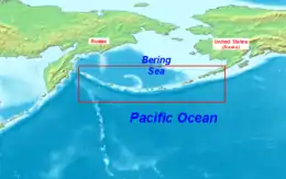 The Aleutian Islands (/əˈluːʃən/;[2][3] Russian: Алеутские острова; Aleut: Unangam Tanaa, literally "Land of the Aleuts", possibly from Chukchi aliat, "island"), also called the Aleut Islands[4] or Aleutic Islands[5] and known before 1867 as the Catherine Archipelago, are a chain of 14 large volcanic islands and 55 smaller islands. Most of the Aleutian Islands belong to the U.S. state of Alaska, but some belong to the Russian federal subject of Kamchatka Krai.[1] They form part of the Aleutian Arc in the Northern Pacific Ocean, occupying an area of 6,821 sq mi (17,666 km2) and extending about 1,200 mi (1,900 km) westward from the Alaska Peninsula toward the Kamchatka Peninsula in Russia, and act as a border between the Bering Sea to the north and the Pacific Ocean to the south. Crossing longitude 180°, at which point east and west longitude end, the archipelago contains both the westernmost part of the United States by longitude (Amatignak Island) and the easternmost by longitude (Semisopochnoi Island). The westernmost U.S. island in real terms, however, is Attu Island, west of which runs the International Date Line. While nearly all the archipelago is part of Alaska and is usually considered as being in the "Alaskan Bush", at the extreme western end, the small, geologically related Commander Islands belong to Russia.