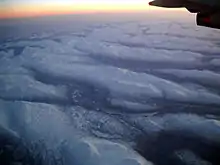 Motion between the Kula Plate and the North American Plate along the margin of the Bering Shelf (in the Bering Sea north of the Aleutian arc) ended in the early Eocene. The Aleutian Basin, the ocean floor north of the Aleutian arc, is the remainder of the Kula Plate that was trapped when volcanism and subduction jumped south to its current location at c. 56 Ma.[6] The Aleutian island arc, then, formed in the Early Eocene (55–50 Ma) when the subduction of the Pacific Plate under the North American Plate began. The arc is made of separate blocks that have been rotated clockwise. The basement underlying the islands is made of three stratigraphic units: an Eocene layer of volcanic rock, an Oligocene—Miocene layer of marine sedimentary rock, and a Pliocene—Quaternary layer of sedimentary and igneous rock.[7]