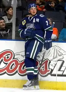Biega started the 2015-16 season with the Comets where he was named captain at the start of the season.[12] He was called up to the Canucks in mid-December and on December 20, 2015, Biega earned his first career assist. It came on a Jannik Hansen goal in a 5−4 shootout loss to the Florida Panthers.[13] On February 2, 2016, Biega signed a one-way, two-year contract extension valued at $1.5 million.[14]