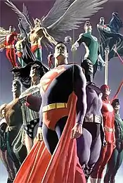 In 1996, Ross worked with writer Mark Waid on the DC Comics limited series Kingdom Come,[13] which presents a possible future for the DC Universe, in which Superman and several other classic superheroes return from retirement to tame a generation of brutal anti-heroes. The work featured Ross' redesigned versions of many DC characters, as well as a new generation of characters. Ross co-created the original character Magog, patterning his appearance and costume on Cable and Shatterstar, two characters created by Rob Liefeld.[14][15] DC Comics writer and executive Paul Levitz observed that "Waid's deep knowledge of the heroes' pasts served them well, and Ross' unique painted art style made a powerful statement about the reality of the world they built."[16]