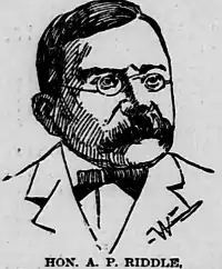 Alexander Pancoast Riddle (born Harlansburgh, Pennsylvania, August 16, 1846; died near Salina, Kansas, May 13, 1909) was a notable American newspaperman and Republican politician of Ottawa County, Kansas;[1] he served as the 11th lieutenant governor of Kansas from 1885 to 1889.