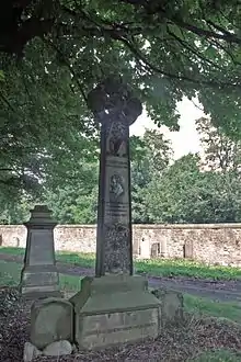 He contracted diphtheria in November 1866. That became compounded with typhoid fever.[lower-alpha 7] By the end of the year he seemed to be rallying but the combination was too much. He died at home on 5 January 1867 aged thirty-seven,[3] and was buried five days later in Warriston Cemetery. His red sandstone cross stands close to the old East Gate (now sealed). It was designed by James Drummond (1816–1877) and stonework carved by John Rhind with a bronze head added by William Brodie.[8]