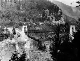 A difficult and costly trail, intended to link Fort Langley with New Caledonia because of the loss of the old route in the wake of the Oregon Treaty of 1846, began on the east bank of the river and switchbacked up the mountainside, with "staircases" made for the mules and other pack animals. Dangerous and beset with difficult snows, the trail was abandoned after only a few uses and superseded by trails connecting inland farther south.[3] There is mention of a pole-bridge built by aboriginal people at the site, torn down to make way for the "new" one of the 1860s, but a ferry also operated in this area connecting with Kequaloose on the east bank, where the Brigade Trail begins its climb over the Cascade Mountains before descending back to the Fraser via the Anderson River at Boston Bar. During the Fraser Canyon Gold Rush in 1858, a ferry service was established here in a monopoly situation, as J.W. Hicks, the magistrate at Yale, had his "fingers in the pie," as with many other businesses under his official purview.[4] (Hicks was fired because of his various indiscretions during the affair known as McGowan's War.)