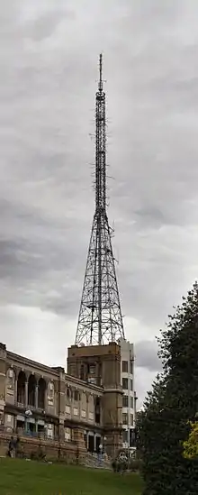 ![]() The transmission mast above the BBC wing of Alexandra Palace, photographed in 2001. | |