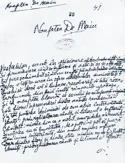 In the meantime, Literatorul went out of print, although new series were still published at irregular intervals until 1904 (when it ceased being published altogether).[113] The magazine was reportedly hated by the public, causing Macedonski, Stoenescu, Florescu, Urechia and educator Anghel Demetriescu to try to revive it as Revista Literară ("The Literary Review", published for a few months in 1885).[114] The poet attempted to establish other magazines, all of them short-lived, and, in 1887, handed for print his Naturalist novella Dramă banală ("Banal Drama")[115] while completing one of the most revered episodes in the Nights series, Noaptea de mai ("May Night").[116] Also in 1886, he worked on his other Naturalist novellas: Zi de august ("August Day"), Pe drum de poștă ("On the Stagecoach Trail"), Din carnetul unui dezertor ("From the Notebook of a Deserter"), Între cotețe ("Amidst Hen Houses") and the eponymous Nicu Dereanu.[115]
