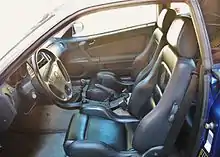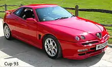 The GTV Cup is a limited edition inspired by the mono-make Alfa GTV Cup race series in Italy. Only 419 cars were built in total,[18][19] with 264 LHD versions and 155 RHD versions. Two different engines were used in the production: 180 cars were built with the 3.0 V6 24V (all 155 RHD versions were 3.0 models) and 239 cars with 2.0 Twin Sparks.[20] The 3.0 V6 cars were only painted in Alfa Romeo Red while 2.0 TS cars were almost exclusively painted in Grigio Chiaro (there are just a few examples in red).[21] Limited edition plaques, that were made of silver, differed for the RHD and LHD versions, having red and black texts accordingly and each run was separately numbered (i.e. there is both a LHD 001 and a RHD 001). Differences between the standard GTV and the Cup version are factory fitted rear spoiler, front spoiler, side skirts, wheel arch side vents and titanium-like finish 17-inch 'telephone dial' alloys;,[22] although mechanically they are the same as the regular specifications. The Cup exclusive interior offers half-leather upholstery and the plastic centre console fascias were finished in a darker shade of grey. 2.0 TS GTV Cups have 4-pot Brembo callipers as have 3.0 V6 GTVs.