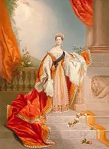 Known for his portraits of the good society of London, he was chosen by Queen Victoria to paint a gift to her mother:[3] Victoria in her State robes going to the House of Lords for her first official act, the prorogation of the Parliament, on 17 July 1837. After this task, Chalon was entitled Portrait Painter in Water Colour to Her Majesty and gained some celebrity. His 1837 portrait was engraved by Samuel Cousins and distributed to the public the day of Victoria's coronation, the 28 June 1838.[3][4][5] Then, starting in 1851, the "Chalon head" appeared on some British colonies postage stamps.