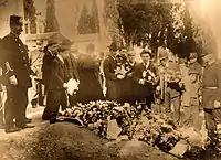 Ironically, the acclamation government of Ferreira do Amaral permitted public mourning by republicans, who had apologized for the assassinations and who considered the assassins friends of the Fatherland. Approximately 22,000 people would pay their respects at the graves of Costa and Buíça; the civil ceremony was organized by the Civil Registry Association, which furnished the flowers and paid 500 réis per person and 200 réis per child that appeared at the graves.[10] After the establishment of the Republic, the same Association acquired land in the cemetery in order to construct a monument to the heroic liberators of the Fatherland (as written on the request to the Lisbon city hall authorities in their petition). The monument was eventually dismantled by the Estado Novo government and the bodies transferred to other locations within the cemetery, and the monument's elements were abandoned.