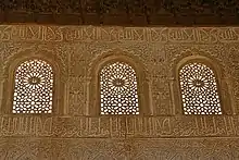 The decoration consists for the upper part of the walls, as a rule, of Arabic inscriptions—mostly poems by Ibn Zamrak and others praising the palace—that are manipulated into geometrical patterns with vegetal background set onto an arabesque setting ("Ataurique"). Much of this ornament is carved stucco (plaster) rather than stone. Tile mosaics ("alicatado"), with complicated mathematical patterns ("tracería", most precisely "lacería"), are largely used as panelling for the lower part. Metal was also not present very mainly. Similar designs are displayed on wooden ceilings (Alfarje).[4] Muqarnas are the main elements for vaulting with stucco, and some of the most accomplished dome examples of this kind are in the Court of the Lions halls. The palace complex is designed in the Nasrid style, the last blooming of Islamic Art in the Iberian Peninsula, that had a great influence on the Maghreb to the present day, and on contemporary Mudejar Art, which is characteristic of western elements reinterpreted into Islamic forms and widely popular during the Reconquista in Spain.