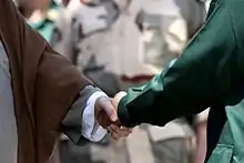 According to his official website, Khamenei was arrested six times before being sent into exile for three years during Mohammad Reza Pahlavi's reign.[19] After the Iranian revolution overthrowing the shah, he was the target of an attempted assassination in June 1981 that paralysed his right arm.[20][21] Khamenei was one of Iran's leaders during the Iran–Iraq War in the 1980s, and developed close ties with the now powerful Revolutionary Guards which he controls, and whose commanders are elected and dismissed by him. The Revolutionary Guards have been deployed to suppress opposition to him.[22][23] Khamenei served as the third President of Iran from 1981 to 1989, while becoming a close ally of the first Supreme Leader, Ruhollah Khomeini. Shortly before his death, Khomeini had a disagreement with the heir he had chosen — Hussein Ali Montazeri — so there was no agreed on successor when Khomeini died. The Assembly of Experts elected Khamenei as the next Supreme Leader on 4 June 1989, at the age of 49. According to Akbar Hashemi Rafsanjani, Khamenei was the man Khomeini had chosen as his successor before dying. Khamenei has been head of the servants of Astan Quds Razavi since 14 April 1979.[24]