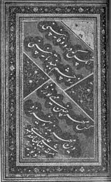 Alireza Abbassi Tabrizi was a prominent Persian[1] calligrapher and calligraphy teacher. He was titled by Abbas I as Šāhnavāz Xān. Abbassi was a master of Naskh and Thuluth scripts and the initiator of his own style of Nastaʿlīq script. Besides he was an expert of various other scripts like Muhaqqaq, Reqa, Reyhan, Tevki and Taʿlīq scripts.[2]